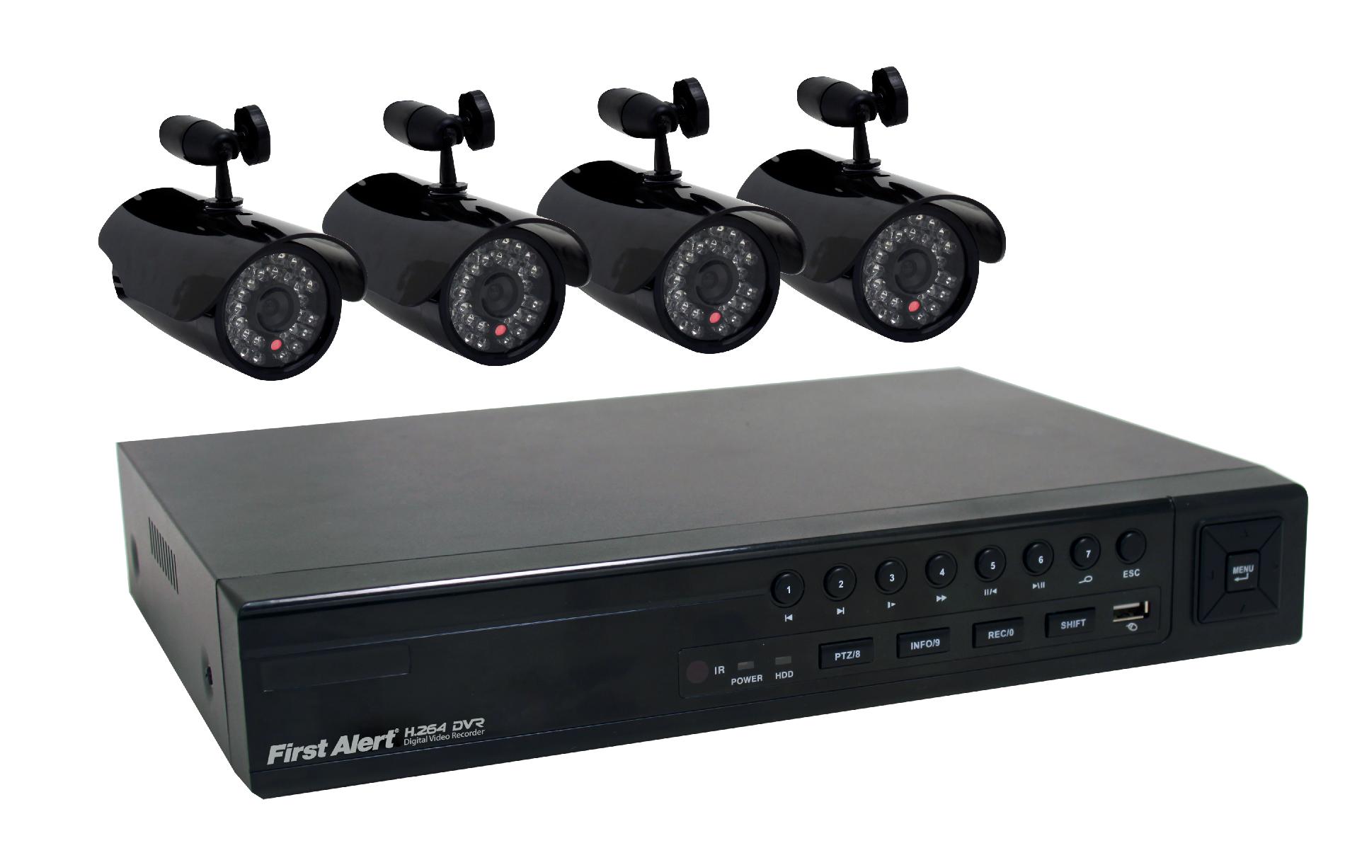 First Alert Security Camera systems are available in systems that can accommodate up to 4 or 8 cameras. For most residential and small business applications this is sufficient for covering a front and rear entrance along with several inside locations . ... Read More
